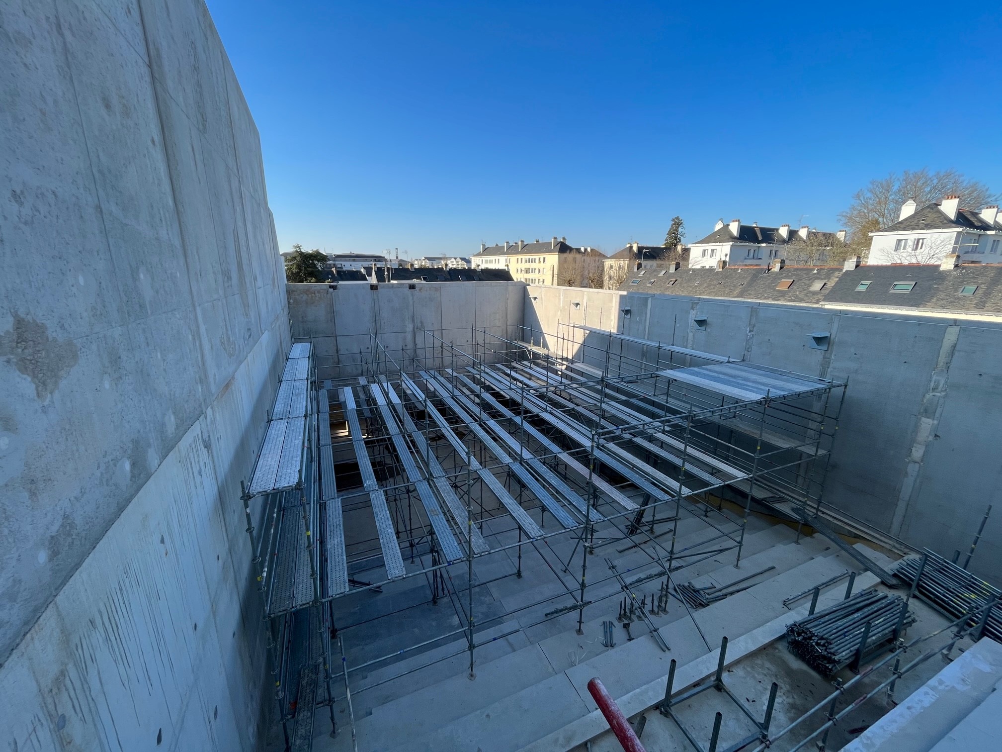 Le conservatoire s’étend sur 6 niveaux, d’un niveau appelé « scène » qui correspond à un niveau semi-enterré jusqu’au R+4. L’agence a traité de gros volumes tels que l’auditorium, les studios de danse et la salle d’ensemble avec des hauteurs sous plafonds de plus de 5 mètres. Le bâtiment comprend ossature béton, ossature métallique, toitures terrasses et charpente bois.